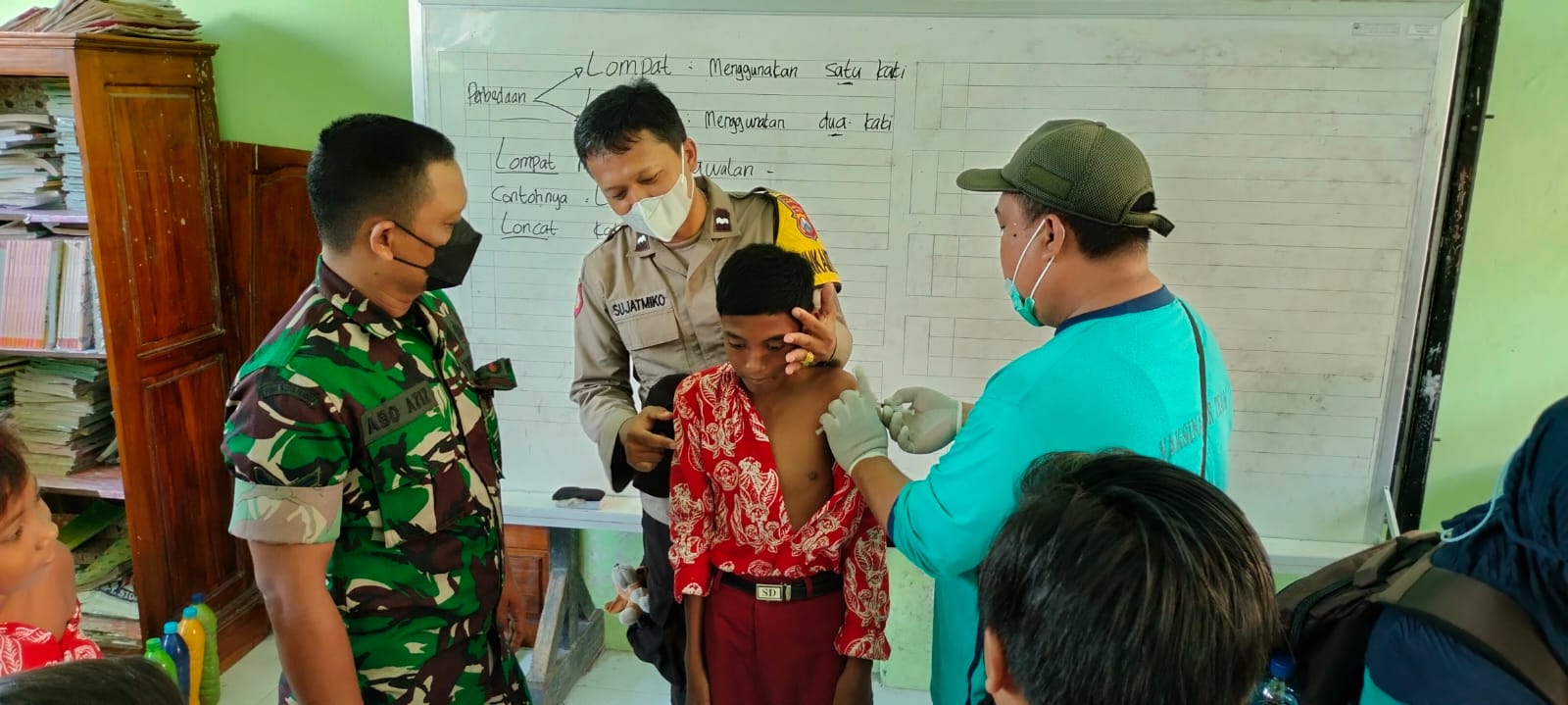 Wujud dukungan penuh terhadap pelaksanaan Outbreak Responze Immunitation (ORI) Difteri di wilayah binaan Koramil 0820/06 Sumberasih, Babinsa Gili ketapang Serda Abd. Aziz bersama Bhabinkamtibmas melaksanakan pendampingan pemberian Vaksin Imunisasi Difteri tahap 3 pada Siswa Siswi SD di Desa Gili Ketapang Kecamatan Sumberasih Kabupaten Probolinggo, senin (31/10/2022).