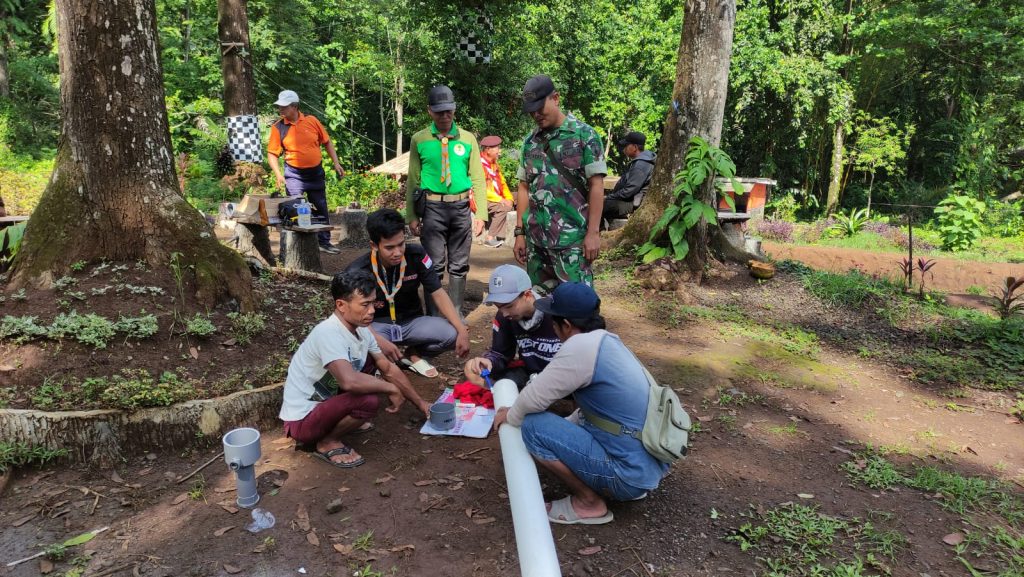 Berlokasi di Kali Gede Desa Lumbang Pelda Mangku personil Koramil 0820/ 09 Lumbang  , membantu warga binaannya membuat jalur pemasangan pipa air yang digunakan untuk mengaliri air bersih  ke Bumi Perkemahan Tirto Ageng dan Dusun Tenggir Desa Lumbang, Rabu (23/11/2022).