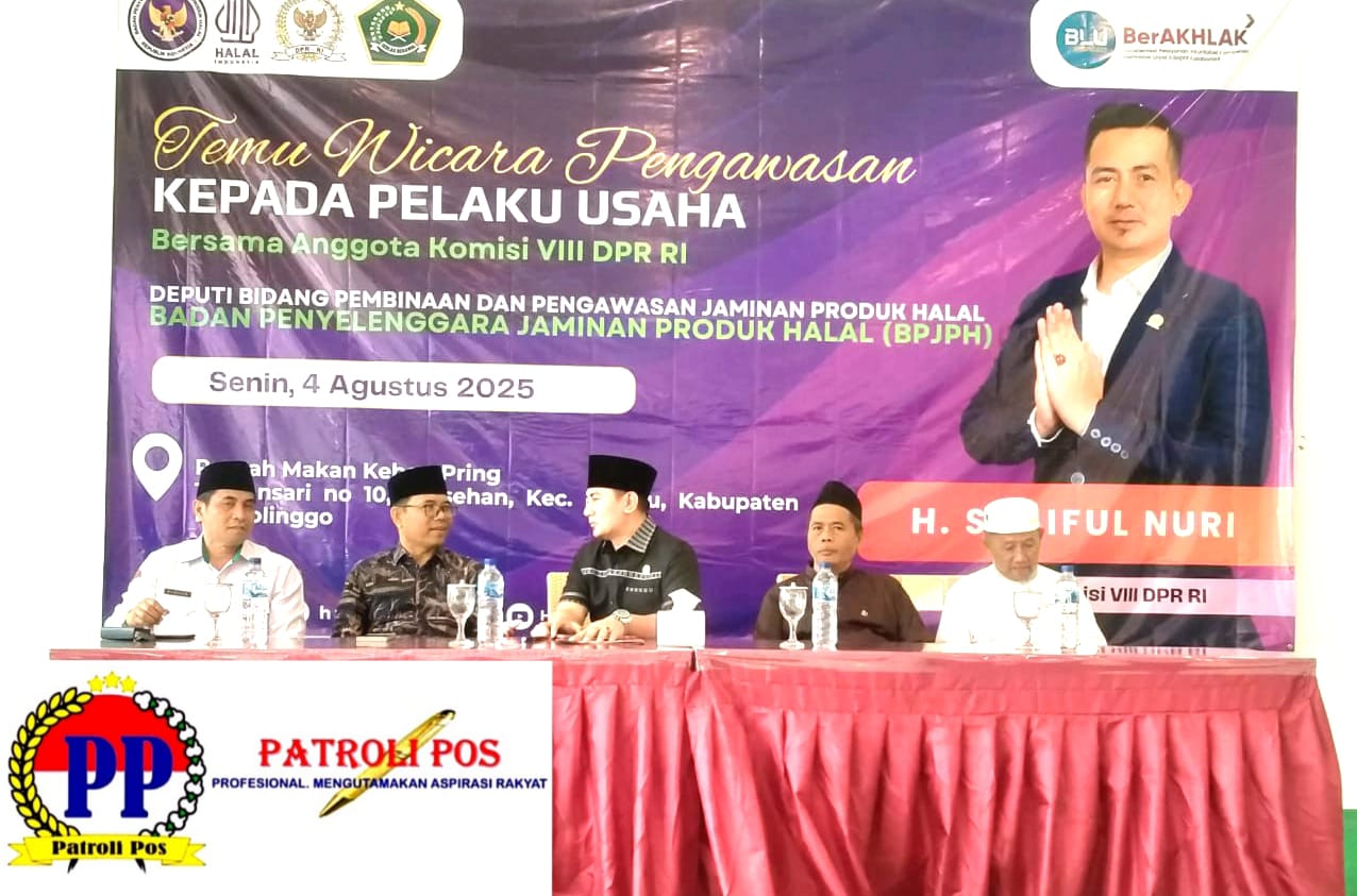 Kepala Kantor Wilayah Kementerian Agama Provinsi Jawa Timur, Dr. Akhmad Sruji Bahtiar, didampingi oleh Kepala Kementerian Agama Kabupaten Probolinggo, Dr. Samsur, menghadiri acara “Temu Wicara Pengawasan Kepada Pelaku Usaha Bersama Anggota DPR-RI Gus Syaiful Nuri dan Deputi Bidang Pembinaan dan Pengawasan Jaminan Produk Halal (BPJPH)”, bertempat di RM. Kebon Pring, Dringu, Senin 04/08/2025.