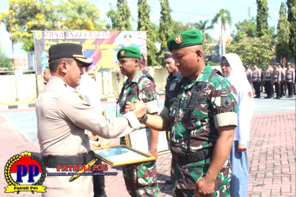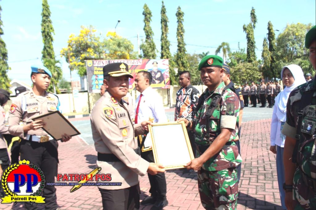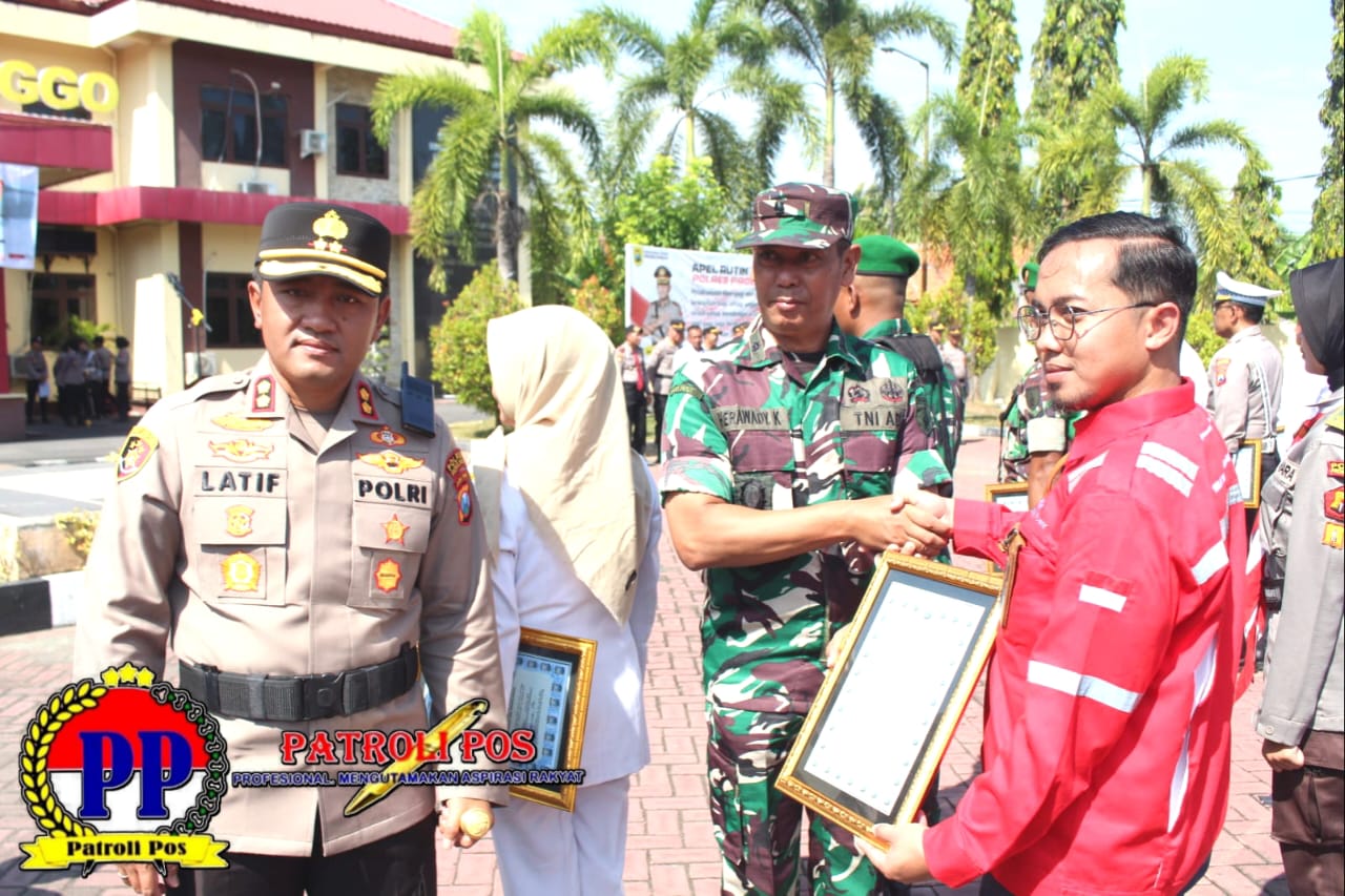 Kasdim 0820/Probolinggo Mayor Inf Herawadi kurnawan menghadiri gelaran apel sinergitas dan pemberian penghargaan kepada anggota yang berprestasi dan masyarakat yang telah membantu tugas aparat keamanan yang difasilitasi oleh Polres Probolinggo, Selasa (30/9).