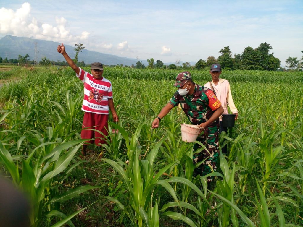 Bertempat di lahan pertanian milik salah satu warga Desa Sidomulyo, Kecamatan Kotaanyar, Kabupaten Probolinggo. Koramil 0820/18 Kotaanyar melakukan pendampingan dalam proses pemupukkan tanaman jagung.