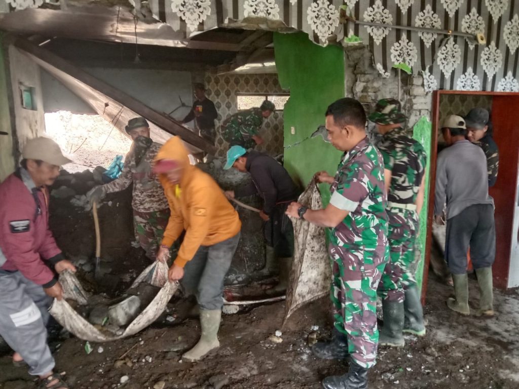 Danramil 0820 /11 Sumber Kapten Infanteri Rianto bersama Anggotanya dan Kepala Desa Wonokerso, anggota Banser serta masyarakat setempat membantu evakuasi salah satu rumah warga yang tertimpa material tanah longsor,di wilayah Dusun Ledoksari, Desa Wonokerso, Kecamatan Sumber, Kabupaten Probolinggo, Minggu (09/10/2022)
