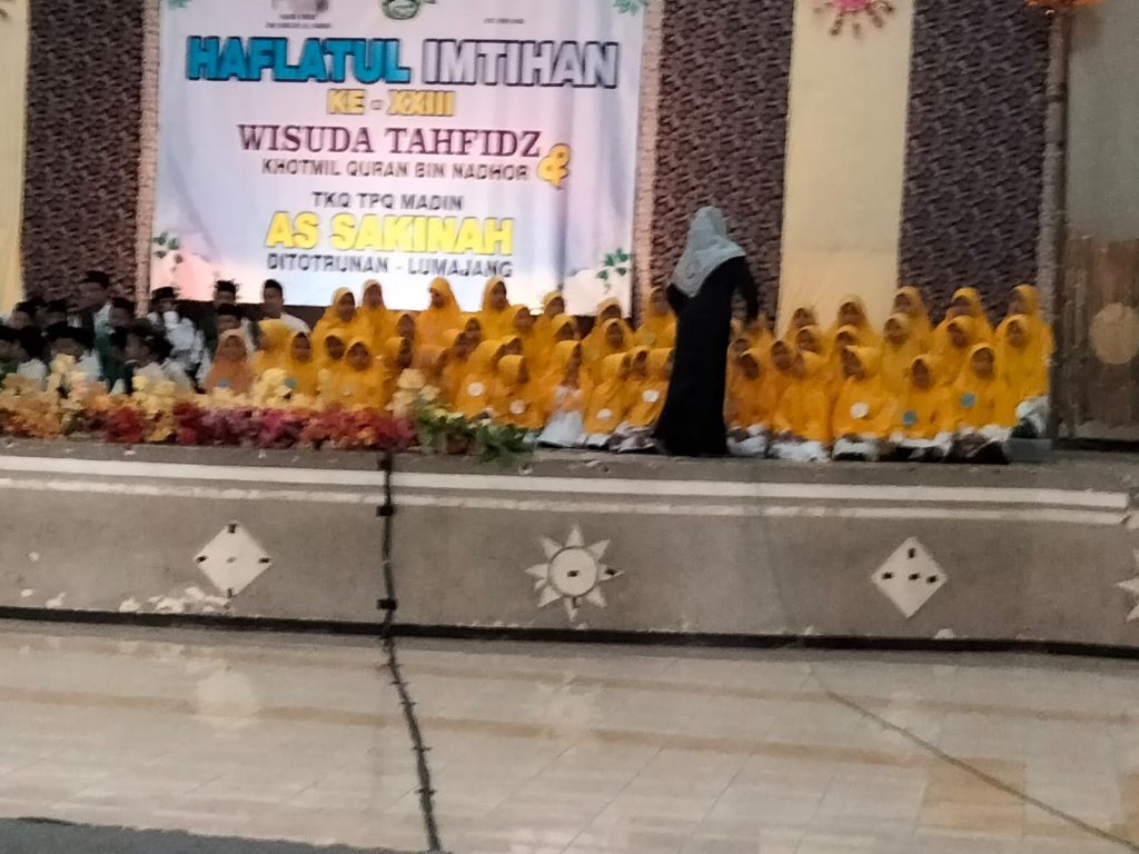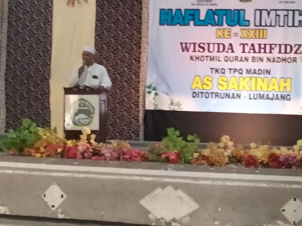 “Ternyata animo dan kepedulian masyarakat sangat tinggi untuk memajukan pendidikan salah satunya dengan mengikutsertakan putra putri mereka ke TPQ atau Madin. Tidak terasa kita dapat mengadakan Imtihan ke 23, sesuai dengan umur As-Sakinah,entah siapa nanti yang akan tersambung ke junjungan kita nabi besar Muhammad Saw.Saya juga mengharapkan jangan sampai wali santri mempunyai suudhon terhadap ustad karena putra putri akan sulit menerima ajaran yang di sampaikan,dan Alhamdulillah,as sakinah mewisudai 5 juz meskipun merosot.Tahun lalu as sakinah dapat mewisudah Satri 9 juz . Untuk itu saya harap kita harus mempunyai perasaan khusnuzon terhadap ustadanya,kalau perlu istikhomah agar anak kita dapat fokus dengan baik.Kalau memang ingin