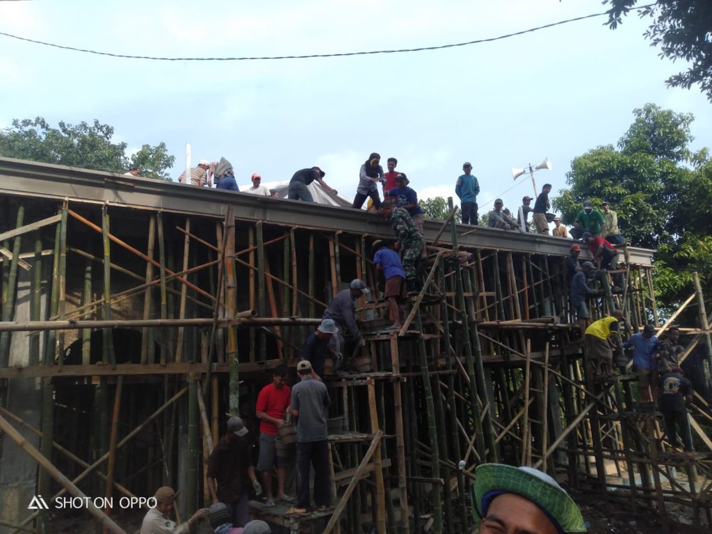 Nampak terlihat Serka Suryadi anggota Koramil 0820/10 Kuripan, Kodim 0820/Probolinggo dengan semangat bahu membahu bersama masyarakat kerja bakti dalam pembangunan Masjid