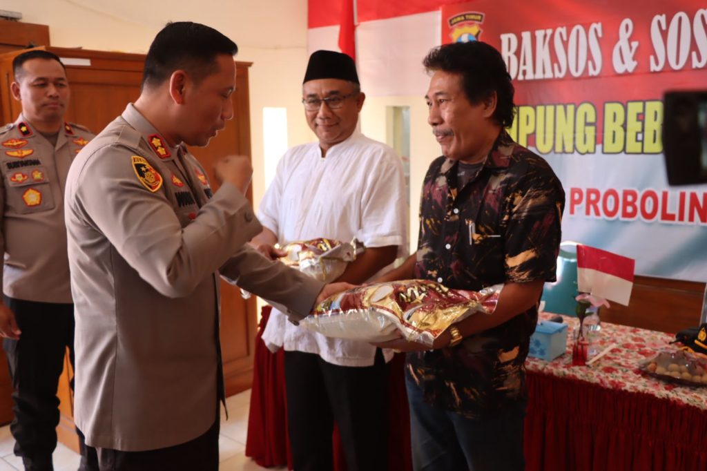 Usai peresmian kampung bebas dari narkoba bersama warga dan pemerintah setempat, AKBP Wadi Sa’bani menyempatkan diri membagikan bantuan sosial bagi warga membutuhkan.