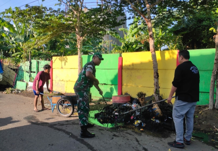 Semangat Kemanunggalan TNI Rakyat begitu nampak saat Sertu Suparno dan Serda Wahyu Anggota Babinsa dari Koramil 0820/ 01 Kanigaran melaksanakan kerja bakti pembersihan lingkungan bersama warga masyarakat Kampung Dok Rw. 06 Kelurahan Mayangan Kecamatan Mayangan Kota Probolinggo. Senin (4/12).