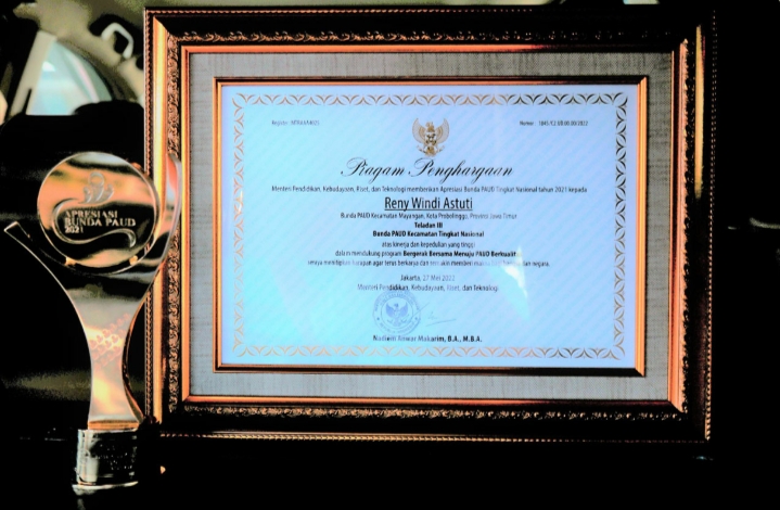 Bunda Paud Kota Probolinggo Aminah Hadi mengapresiasi prestasi Reny Windi Astuti yang berperan sebagai Bunda PAUD Kecamatan Mayangan beberapa waktu lalu. Peraih penghargaan teladan III tingkat nasional ini menerima piala dan sertifikat dari Kementerian Pendidikan, Kebudayaan, Riset dan Teknologi Menteri Nadiem Anwar Makarim, Sabtu (27/5).