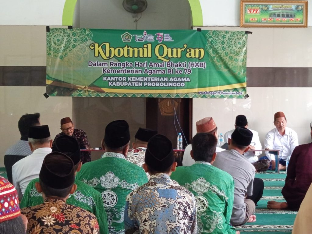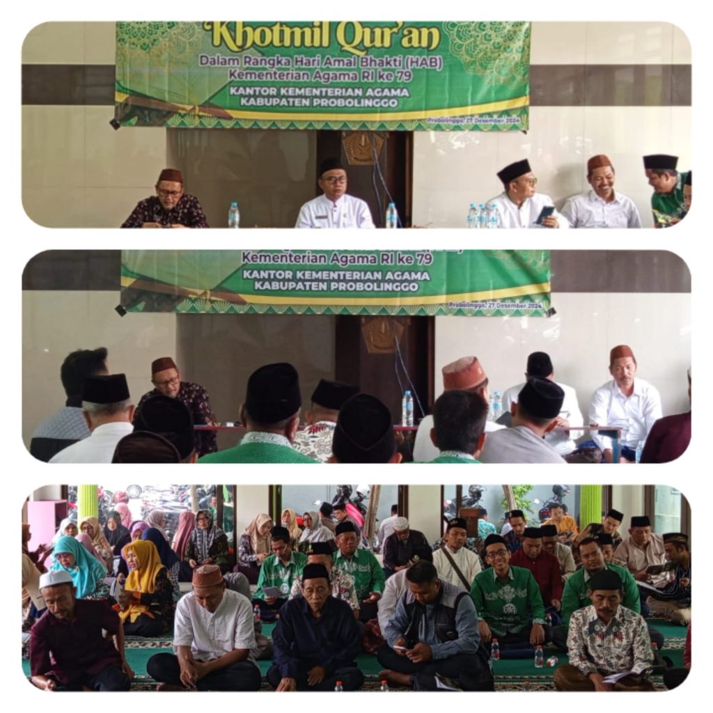 Serangkaian kegiatan acara Hari Amal Bakti (HAB) Kemenag RI ke-79 tahun 2025, Kantor Kementerian Agama Kabupaten Probolinggo,pelaksanakan Kegiatan Khotmil Qur’an yang di ikuti Oleh 13 Penyuluh Agama Fungsional, 65 Penyuluh Agama PPPK, dan 165 Penyuluh Agama Non PNS yang berada di lingkungan Kantor Kementerian Agama Kab.Probolinggo, di Masjid Ar Rohiem. Jum’at, (27/12/2024)