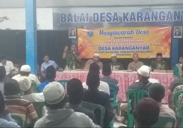 Bati tuud Koramil 0820/16 Paiton Serma Babun menghadiri pelaksanaan musyawarah desa terkait verifikasi dan validasi data terpadu kesejahteraan sosial (DTKS) di Kantor Desa Karanganyar Kecamatan Paiton Kabupaten Probolinggo,Sabtu (15/4).