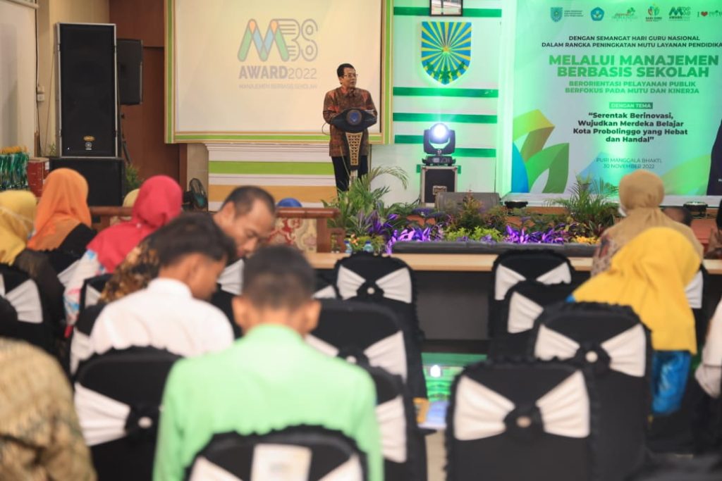 Asisten Administrasi Pemerintahan Gogol Sudjarwo hadir menyerahkan sertifikat, trofi dan hadiah kepada seluruh pemenang MBS Award tahun 2022 yang digelar oleh Dinas Pendidikan dan Kebudayaan setempat. Mengusung tema Serentak Berinovasi Wujudkan Merdeka Belajar Kota Probolinggo yang Hebat dan Handal. MBS 2022 mendorong peningkatan mutu layanan pendidikan yang Berorientasi Pelayanan Publik serta Berfokus Pada Mutu dan Kinerja (MBS-BPP-BPMK).