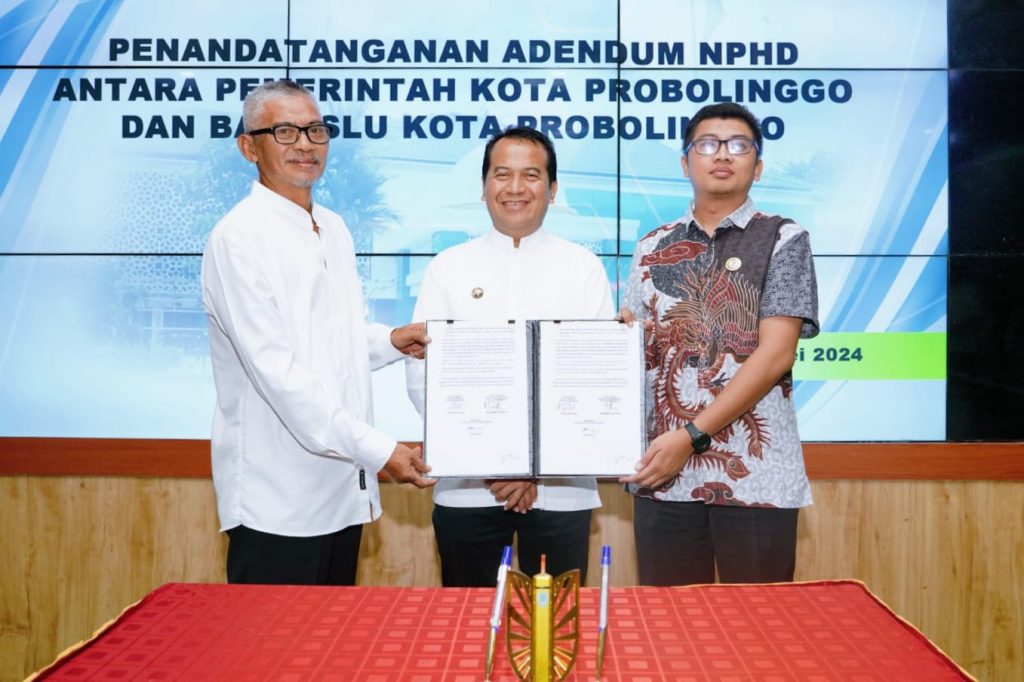 Pemerintah Kota Probolinggo baru saja menyelenggarakan acara penting yang mengukuhkan komitmen dalam penyelenggaraan Pilkada 2024. Pada pukul 15.30 WIB, bertempat di Command Center kantor wali kota, berlangsunglah penandatanganan Adendum Naskah Perjanjian Hibah Daerah (NPHD) terkait pengawasan pemilihan Wali Kota dan Wakil Wali Kota Probolinggo. Acara ini dihadiri oleh sejumlah pejabat tinggi, termasuk Sekda drg. Ninik Ira Wibawati, Asisten Pemerintahan Madihah, dan kepala perangkat daerah lainnya. Penjabat Wali Kota Nurkholis turut menyaksikan langsung penandatanganan yang dilakukan oleh Kepala Bakesbangpol Muhammad Sonhadji dan Ketua Bawaslu Johan Dwi Angga. Jum’at (31/05/24)