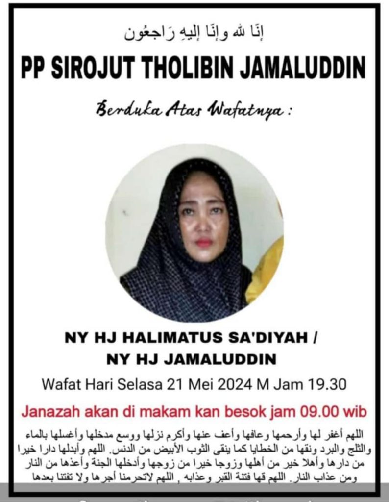 Hari ini suasana duka menyelimuti Desa Pohsangit Leres, Kecamatan Sumberasih, Kabupaten Probolinggo. Ratusan pelayat hadir untuk memberikan penghormatan terakhir kepada Almarhumah Nyai Hj. Halimatus Sa’diyah di TPU Kompleks Pondok Sirojut Tholibin. Rabu (22/05/24)