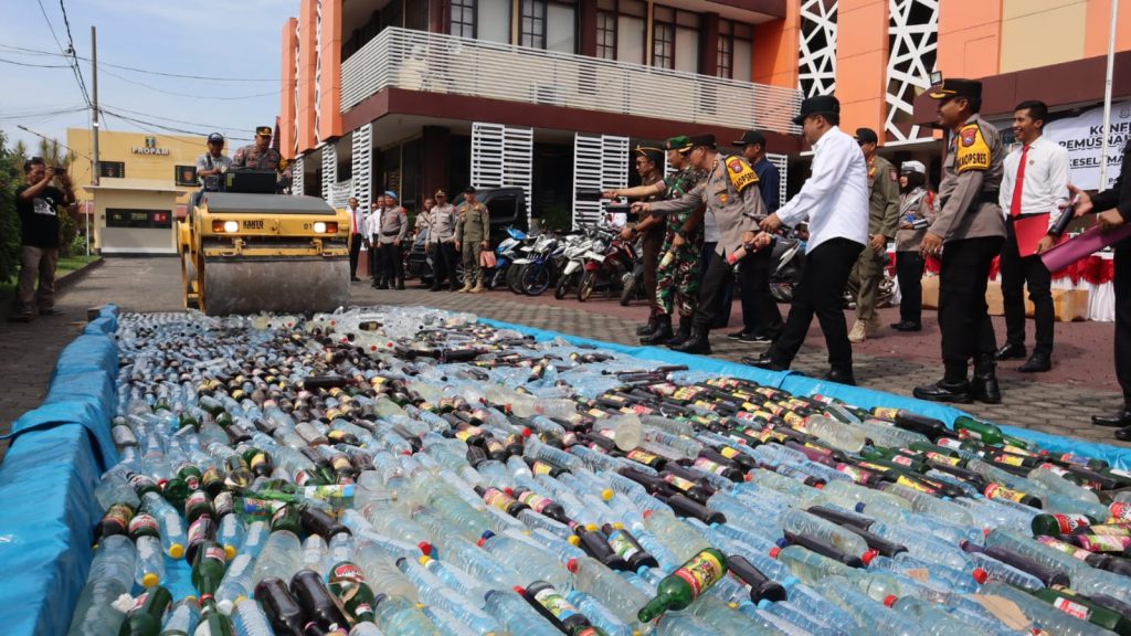 Dalam pemusnahan tersebut, sejumlah barang bukti termasuk 3017 botol minuman keras ilegal, 500 gram ganja, 1000 pil trex, dan 50 knalpot brong dimusnahkan oleh pihak kepolisian. Langkah ini merupakan upaya nyata untuk menekan peredaran barang ilegal dan menciptakan lingkungan yang aman dan nyaman bagi masyarakat. Ujar Kapolres Probolinggo Kota. AKBP Wadi Sa’bani.