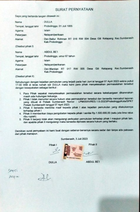 Setelah dilakukan pendekatan dan pemeriksaan oleh Unit Reskrim Polsek Sumberasih dari bulan April 2023 hingga 03 Juli 2023 maka kedua belah Pihak antara Bpk. Dullah dan Bpk. Abdul Be’i Sepakat menyelesaikan permasalahan secara kekeluargaan.