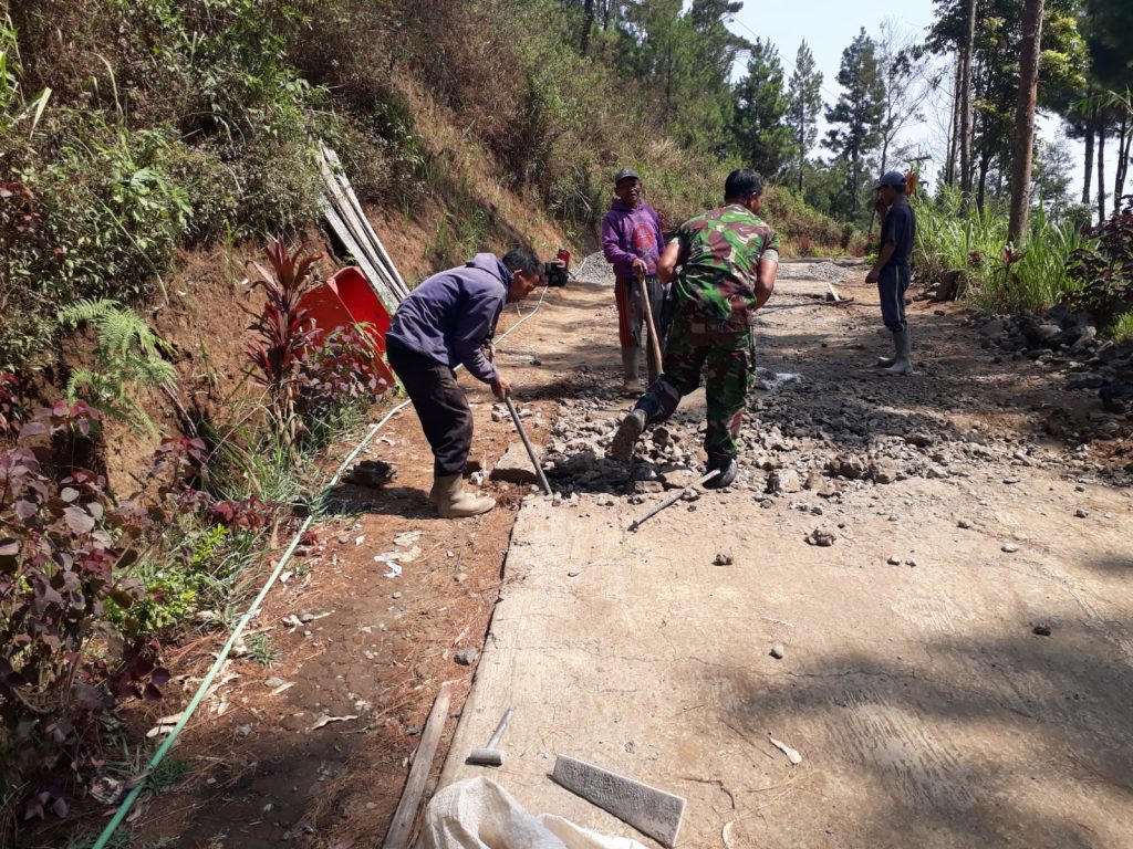 Anggota Koramil 0820/11 Sumber serda Suyanto bersama warga Masyarakat bergotong royong mengadakan Perbaikan jalan yang rusak yang kali ini berlokasi di Desa Sumber Kecamatan Sumber Kabupaten Probolinggo, Rabu (8/11).