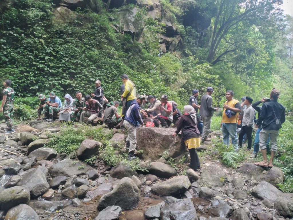 Satgas bersama masyarakat dan kelompok sadar wisata melakukan kerja bakti membersihkan sampah dan ranting-ranting pohon di area Air Terjun Darungan, Desa Kalianan, Kecamatan Krucil, Kabupaten Probolinggo, Minggu (11/8).